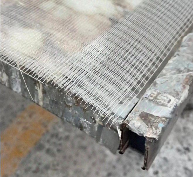 使用 エポキシ樹脂接着剤 石材の裏面に高強度繊維保護メッシュ(メッシュサイズ5×5mm、重量約900g/m²、幅1.2~1.8m)を貼り付けます。硬化後、板の強度が向上します。大理石、花崗岩、トラバーチン、オニキスなどの大型または薄板の補強に適しています。