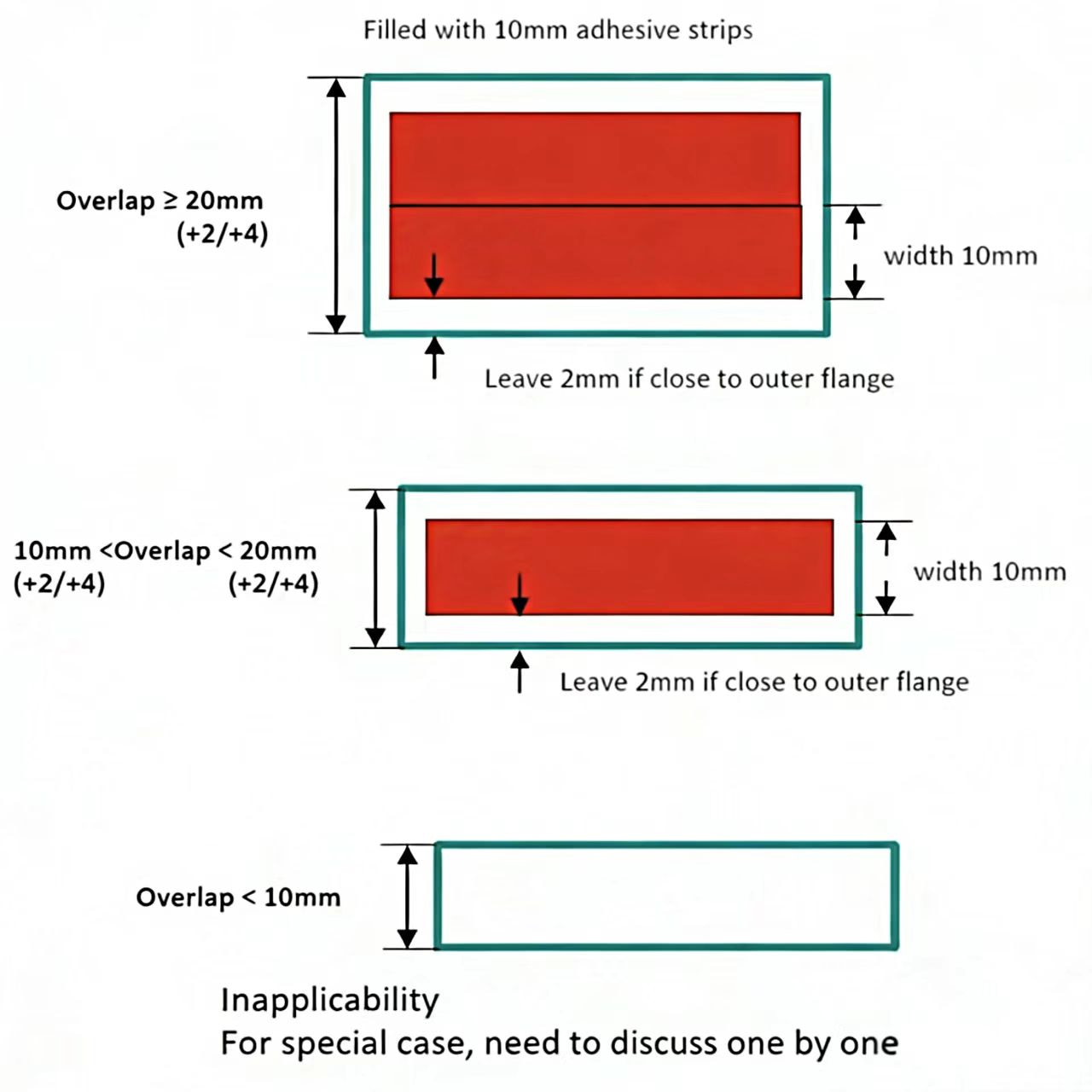 内側フランジと外側フランジの両方に少なくとも2mmの余裕を持たせる必要があります。腐食防止が必要な重ね合わせ部では、接着剤の100%被覆が必須です。