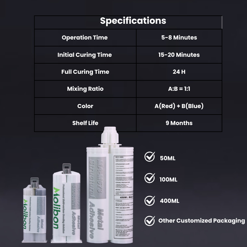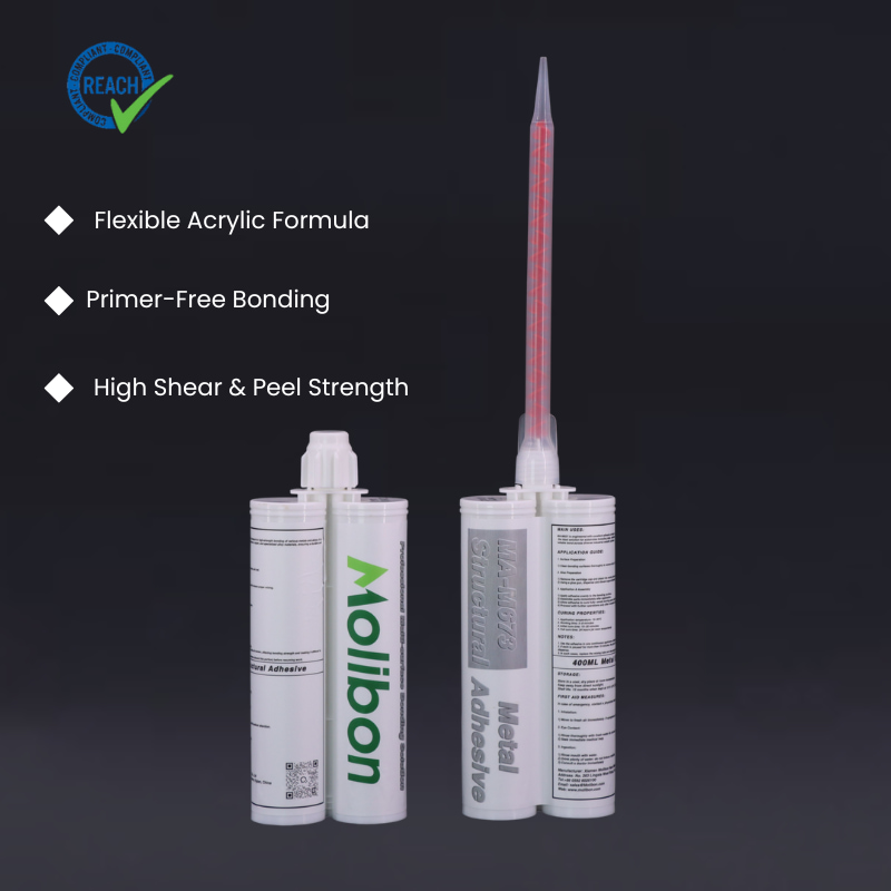 MA-M637は、金属、合金、エンジニアリングプラスチックに強力かつ永続的な接着力を発揮します。 柔軟な接着剤高い剥離強度と優れた耐候性を備えた丈夫な構造で、工業用途や大量生産に最適です。400mlカートリッジもご用意しています。モリボンは OEM ニーズに合わせたパッケージングとカスタムラベル。