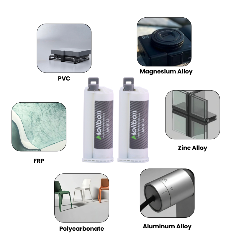 その多素材アクリル接着剤アルミニウム合金やステンレス鋼などの金属から、PCやABSなどのエンジニアリングプラスチックまで、様々な材料を接着します。プライマーは不要です。